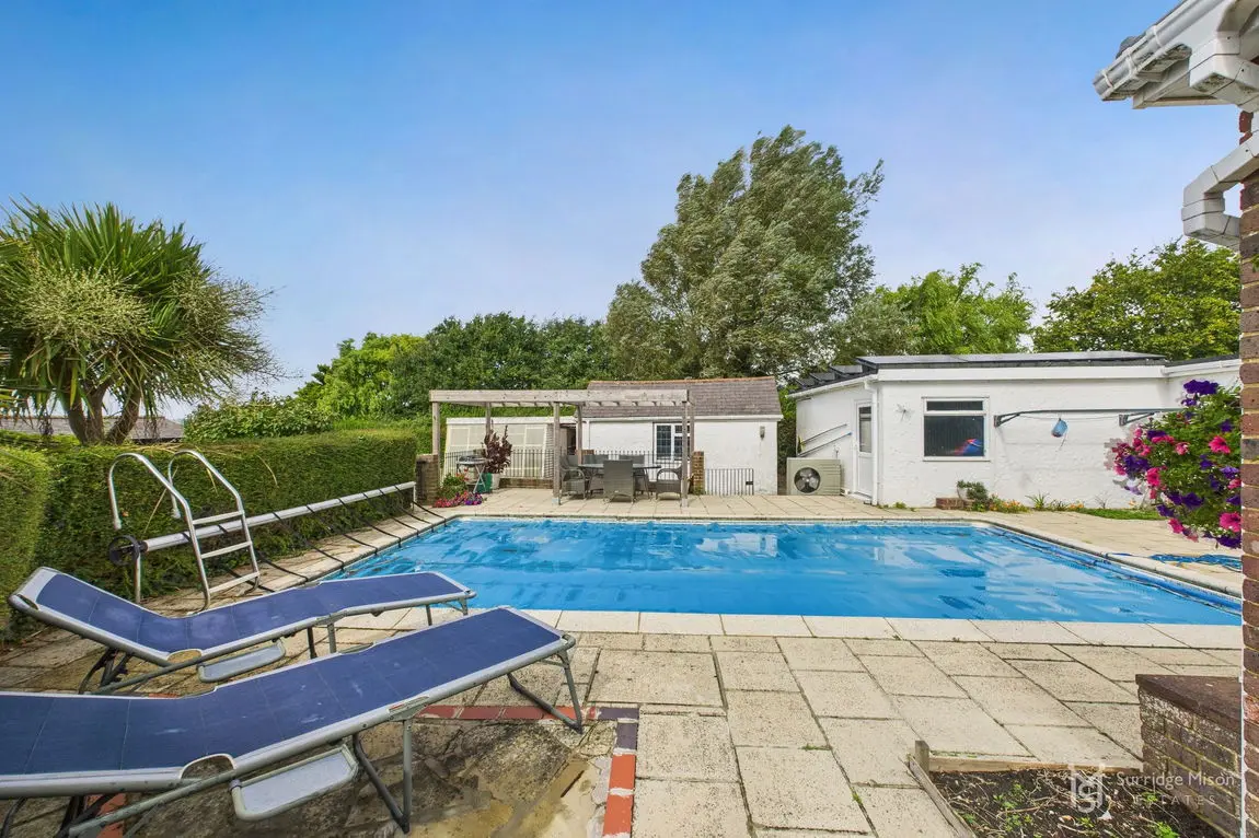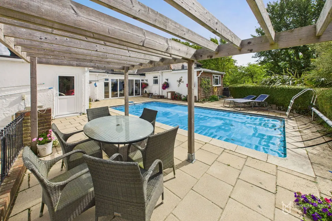On the first floor is the main bedroom, with stunning far reaching views to the South Downs and boasting a modern en-suite shower room, plus a further double bedroom and modern family bathroom. Outside there are an abundance of outbuildings including a double garage, insulated hobby room with power and former stables meaning there is plenty of storage whilst you enjoy the terrace and heated swimming pool and mature, beautifully maintained gardens.