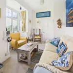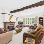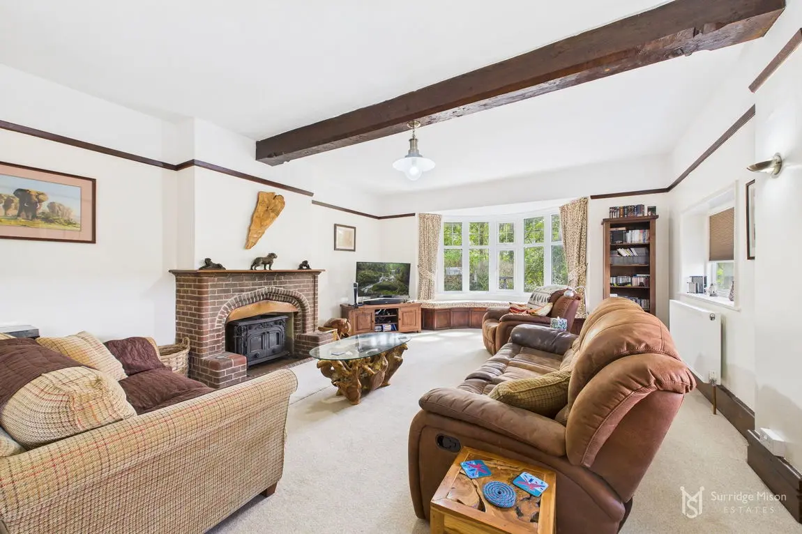 Double aspect room with double glazed bay window to front and two double glazed windows to side. Curved bay window seat. Open fireplace with fitted wood burner, tiled hearth and brick surround. Picture rail. Feature ceiling beam. Two radiators. Wall lights. Carpeted.