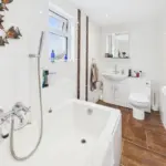 Karndean flooring. Wash hand basin with tiled splashback and W.C.
