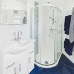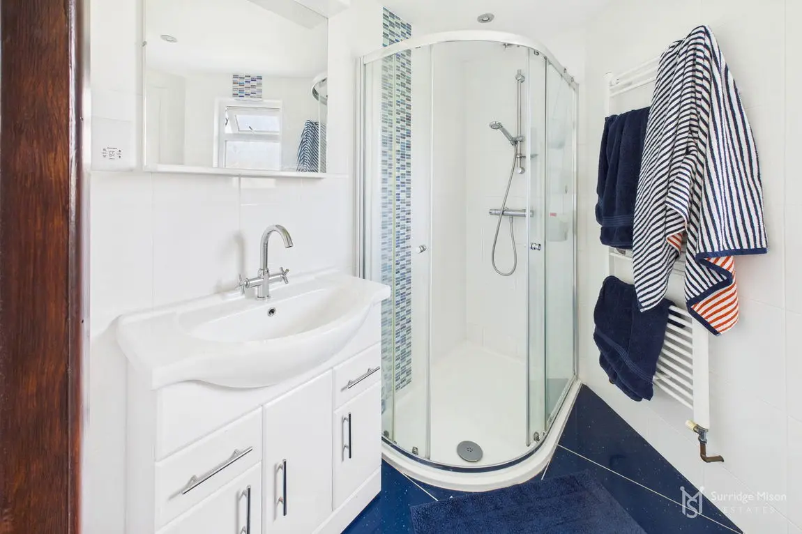 Double glazed opaque window to front. Tiled flooring and fully tiled walls. Inset ceiling spotlights. Towel rail. Extractor fan. Modern white suite compromising of shower cubicle, wash hand basin set within vanity unit and W.C.
