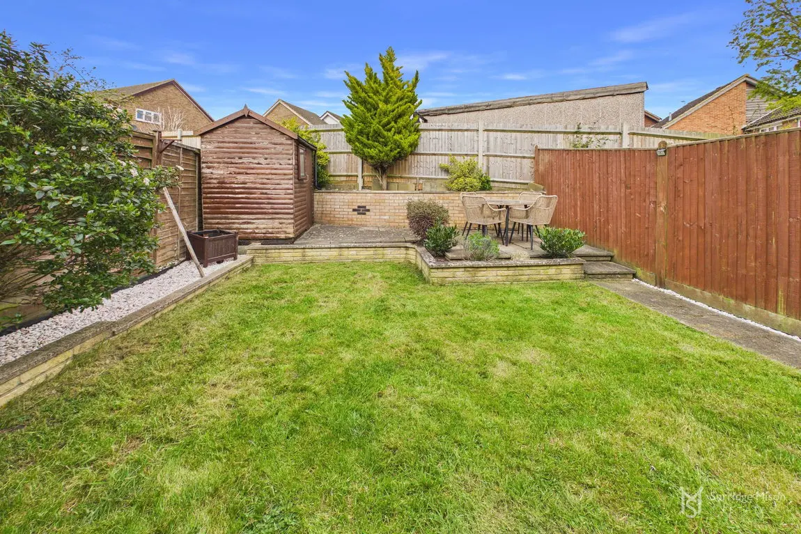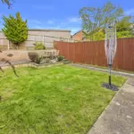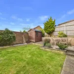 Central lawn, two patios, shed, attractive plant beds, enclosed by timber fencing.