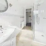 Skylight. Vinyl flooring, Shaver Point. Wash hand basin set within vanity unit and W.C. Storage unit to side.