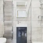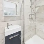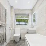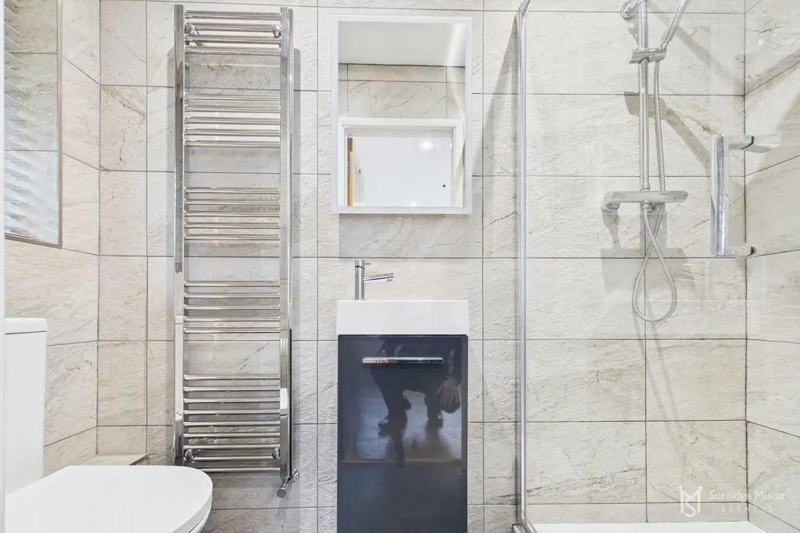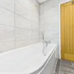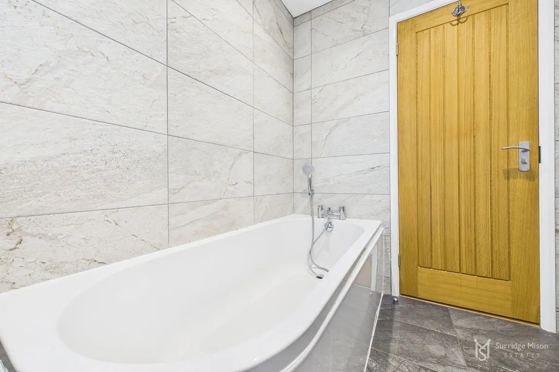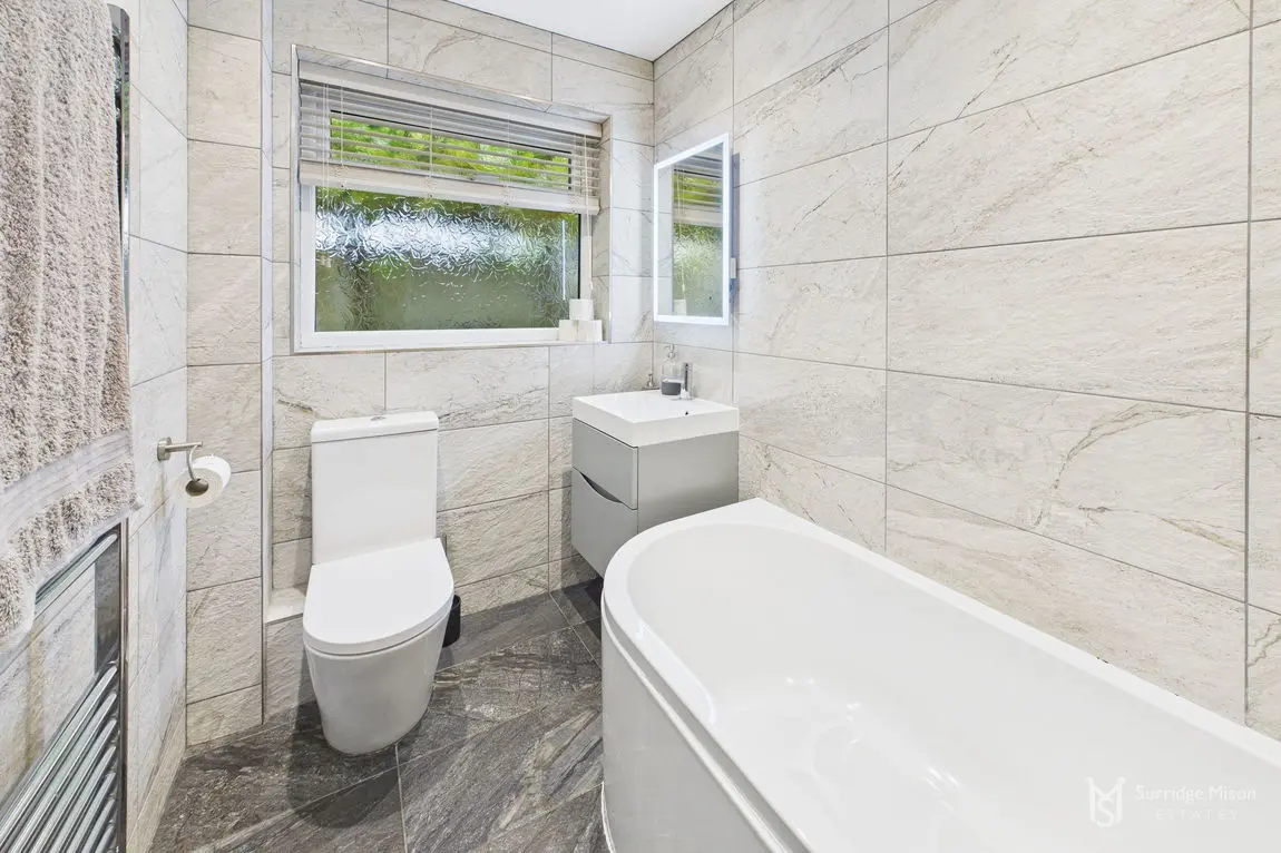 Double glazed opaque window to side. Fully tiled walls and tiled flooring. Inset spotlights. Chrome towel rail. Modern suite compromising of bath with mixer taps and handheld shower attachment, wash hand basin set within vanity unit and W.C.