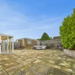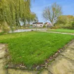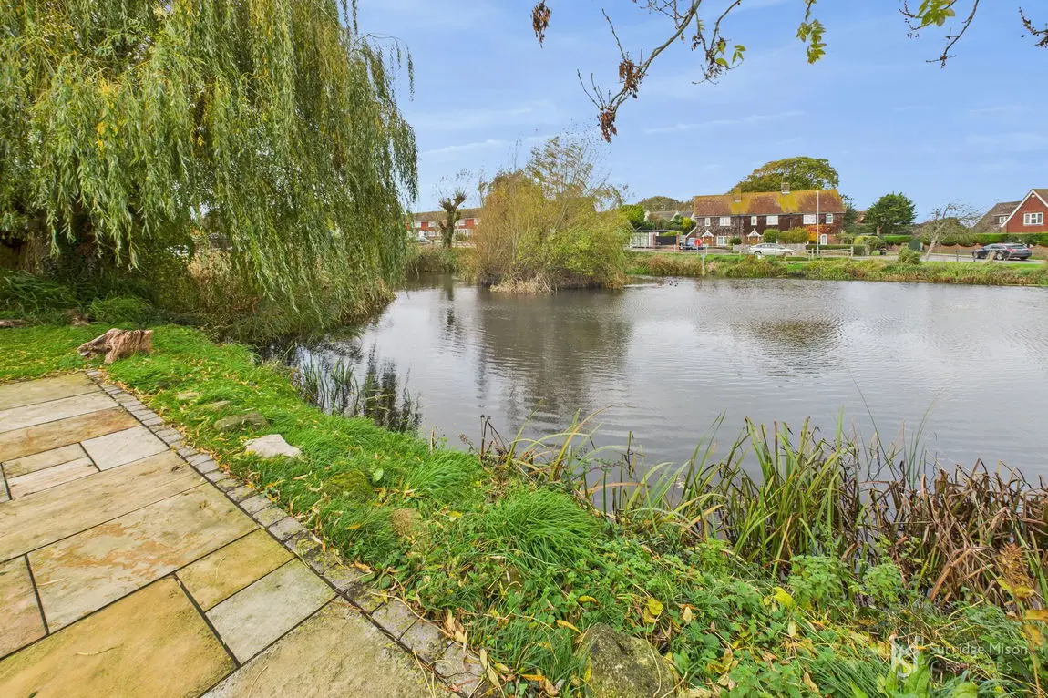 Overlooking the pond. Mainly laid to lawn with patio area. Gated side access. Summer house. Willow tree.