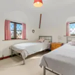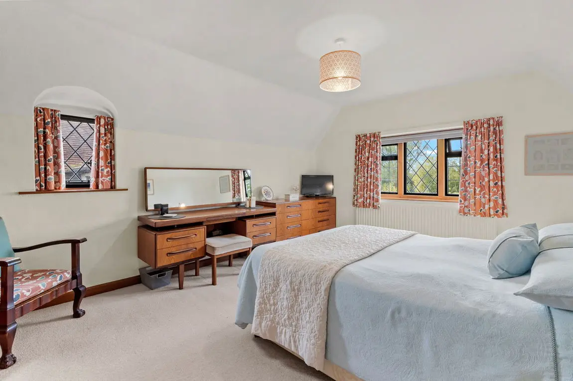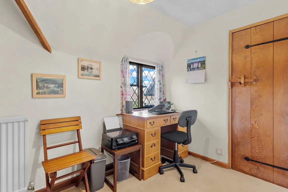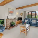 Triple aspect room with glazed windows with secondary glazing to rear, front and side. Feature fireplace. Carpeted. Radiator. Wall lights. Feature beam.