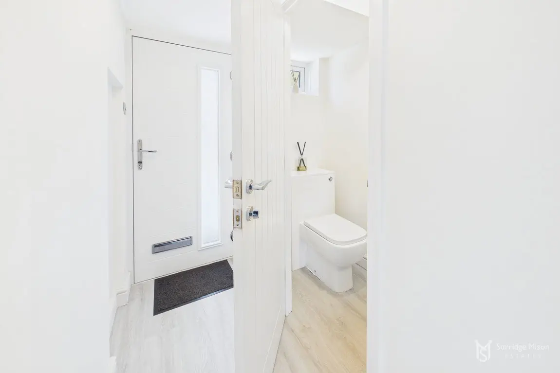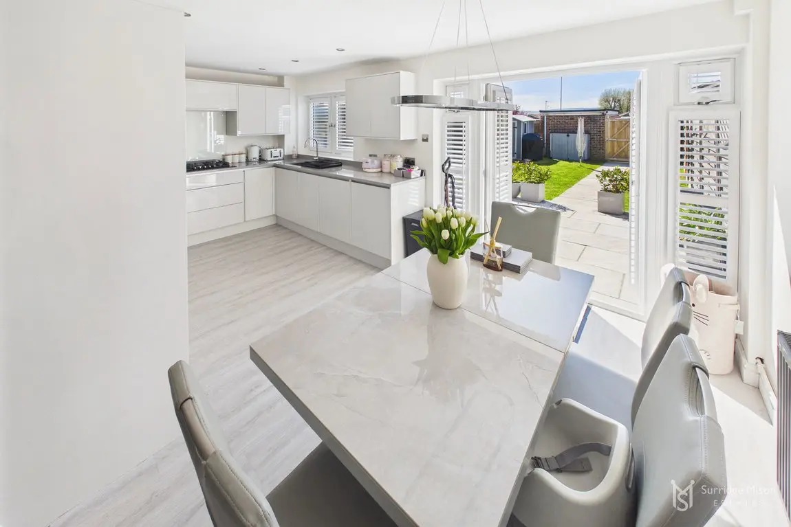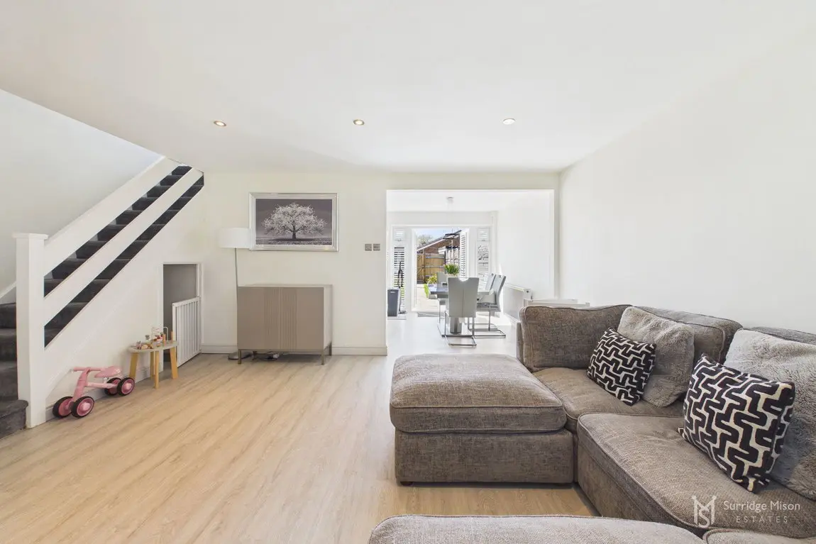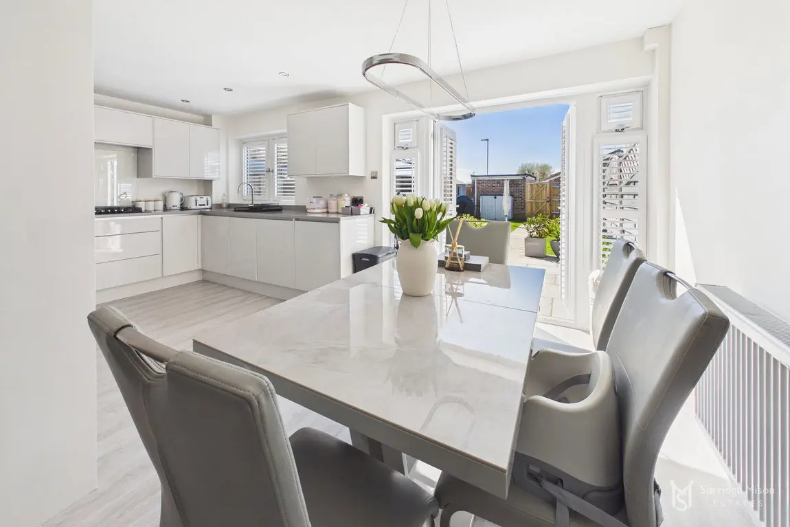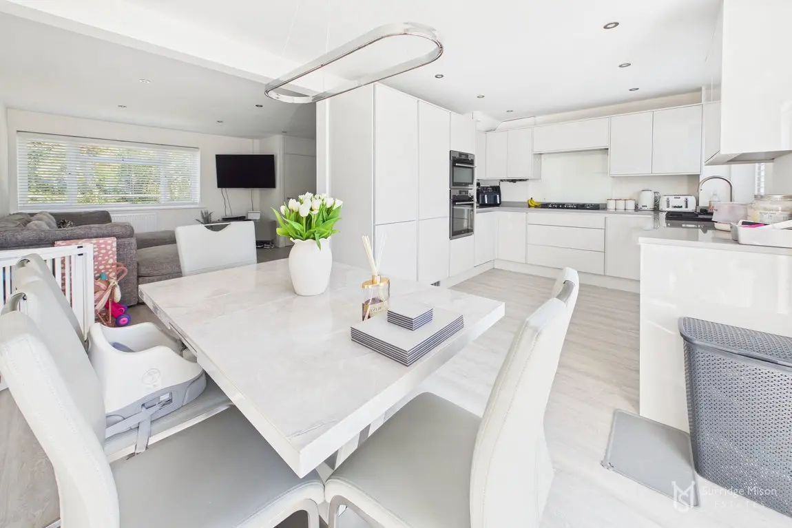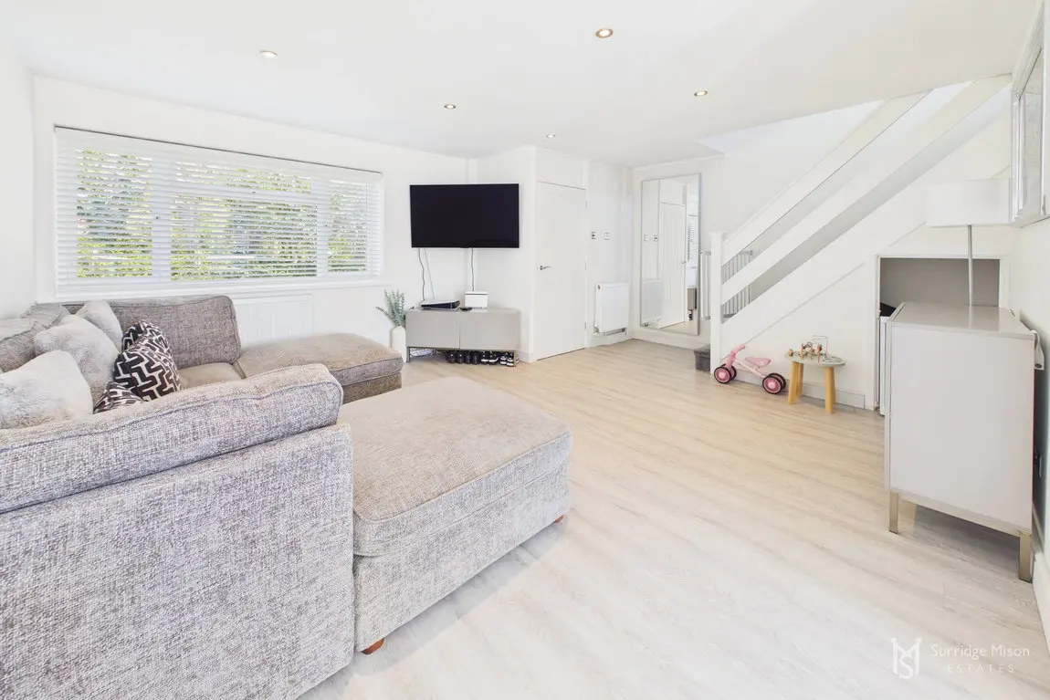 The current owners have meticulously refurbished and re-configured the home to create a bright and spacious retreat ready for any new owner to move in and enjoy. The accommodation begins with an entrance hall with a handy ground floor cloakroom and a new casement front door. Into the spacious lounge which overlooks the front with views of the nearby pond, and has an understairs storage cupboard. The entirety of the ground floor has freshly laid matching flooring. The lounge is open to the stunning kitchen/dining room. The owners removed an existing wall down to create this large kitchen/dining room, an incredibly bright space with a window and French doors leading to the rear garden, with fitted shutters. The kitchen is newly fitted, with integral appliances and Quartz work surfaces.