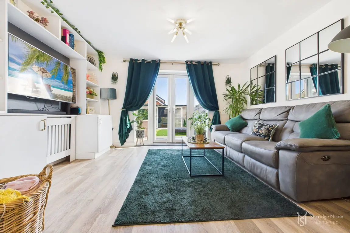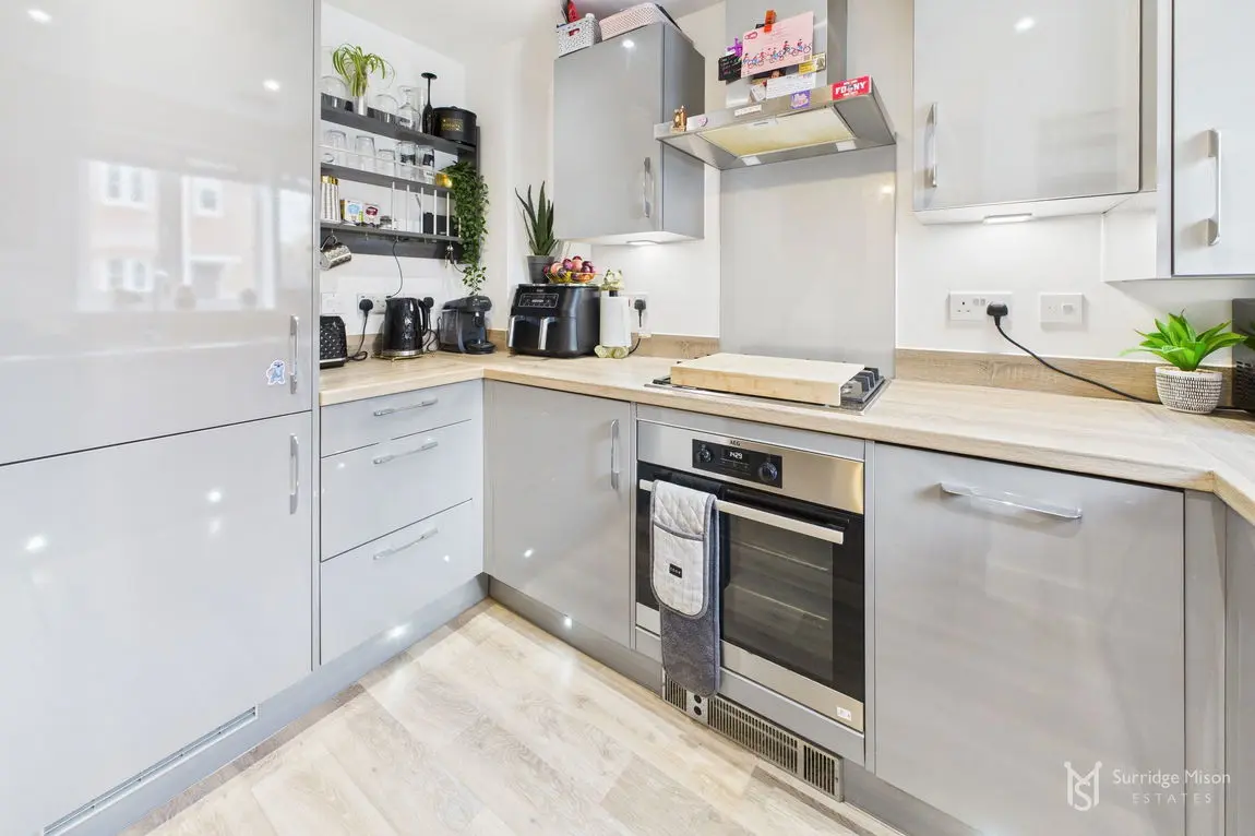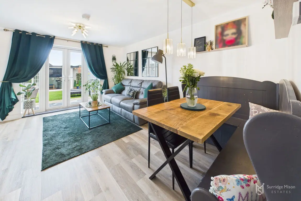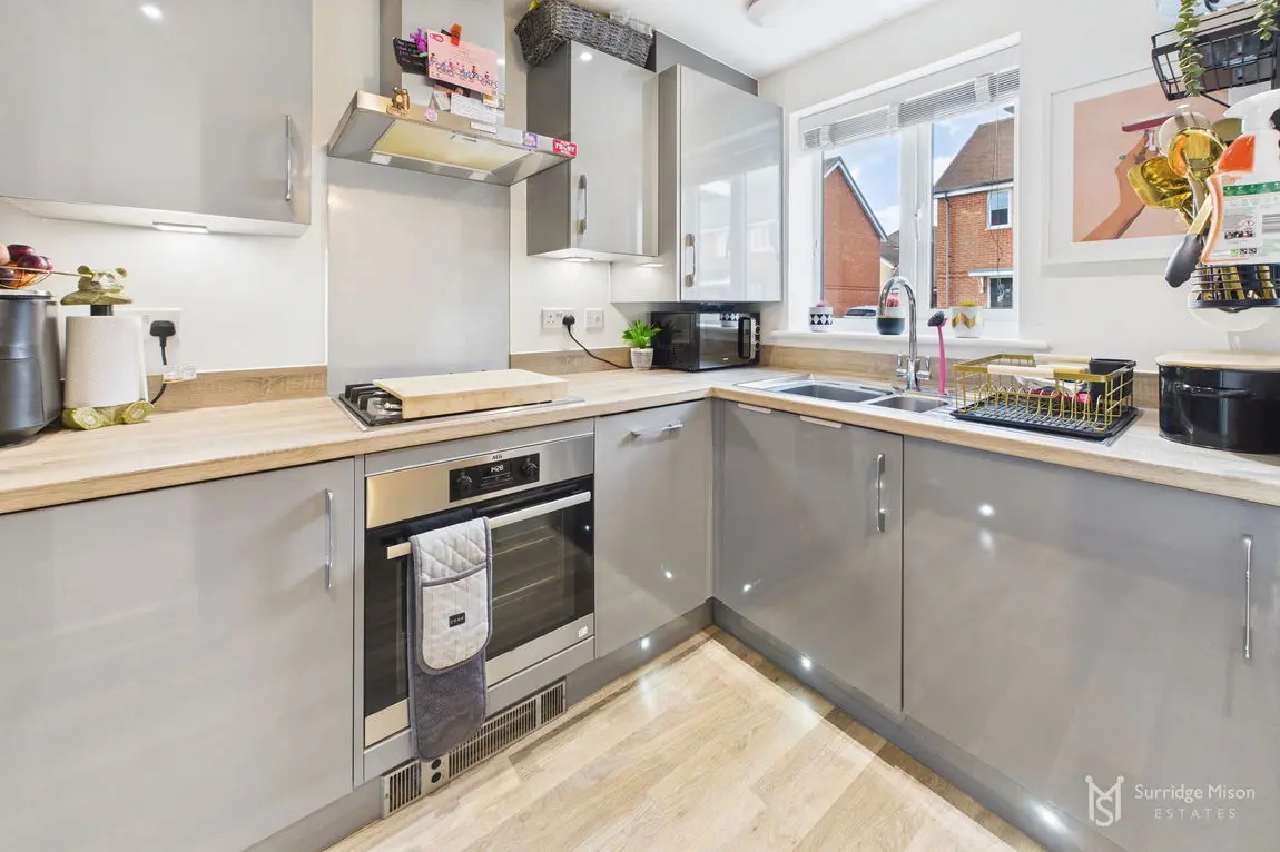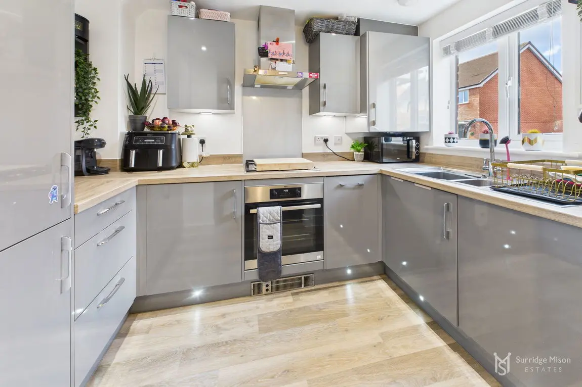 The inviting living space flows seamlessly into a sleek, grey gloss kitchen fitted with high-quality integrated appliances—the perfect space for cooking and entertaining. With a thoughtfully designed layout, this home features a family bathroom, a luxurious en-suite, and an additional ground floor WC, ensuring daily comfort and privacy for all residents.