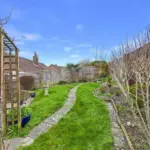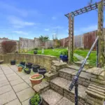 Laid to lawn with patio area and steps leading to pathway. Fencing surrounds with gated access. Shrubs and flower beds. Shed.