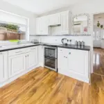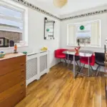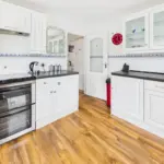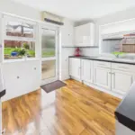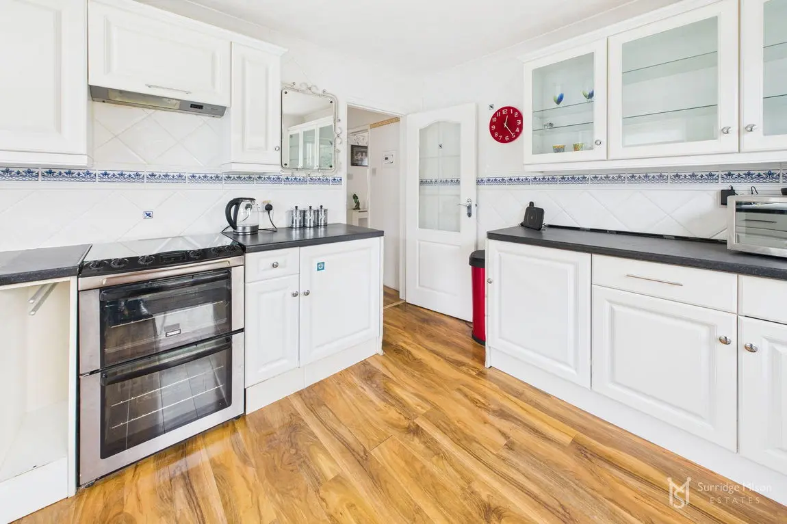 Double aspect room with double glazed window to side and opaque glazed door leading to rear garden. Laminate flooring and tiled walls. Coved ceiling. Fully fitted with a range of white country style wall and base units housing integral fridge, freezer and washing machine. Space for cooker. Black granite effect work surfaces with inset ceramic 1 and 1/2 bowl sink and drainer unit with mixer taps.