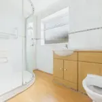 Double glazed opaque window to side. Laminate flooring and tiled walls. Coved ceiling. Towel rail. White suite compromising of large shower cubicle, wash hand basin set within vanity unit and W.C.