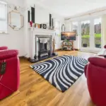 Double aspect room with two double glazed windows to side and French doors leading to rear garden. Laminate flooring. Electric fireplace with tiled hearth. Radiator. Coved ceiling.